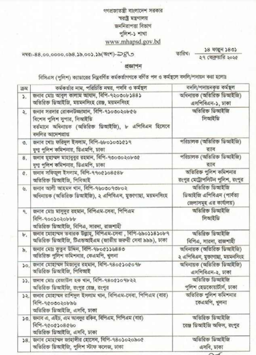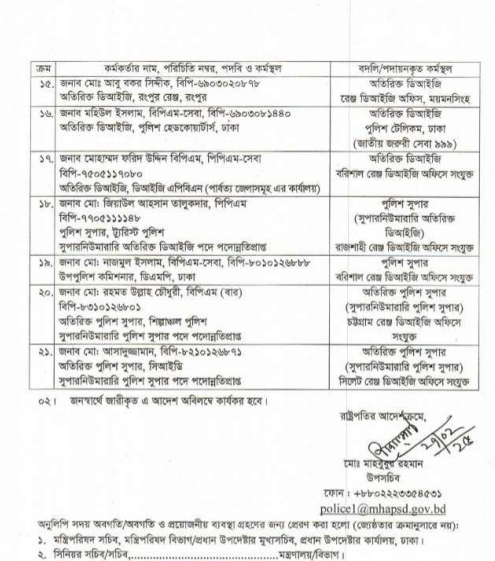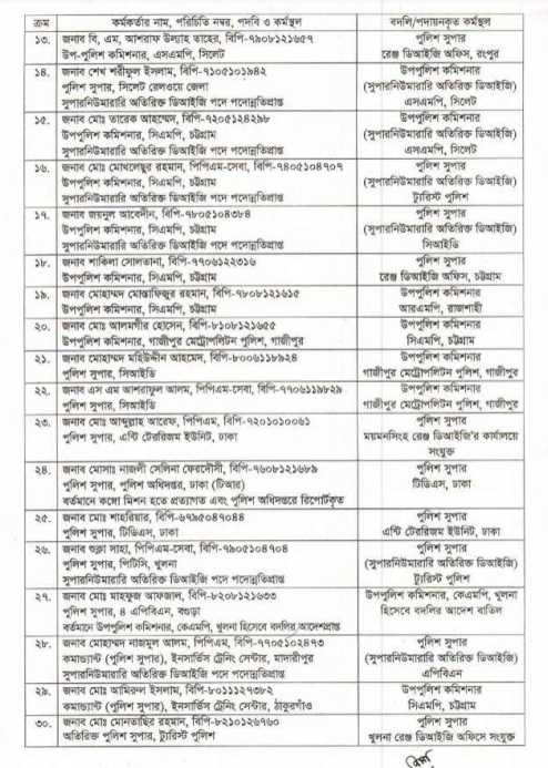 এক প্রজ্ঞাপনে অনুযায়ী, ময়মনসিংহ রেঞ্জের অতিরিক্ত ডিআইজি মো. আবুল কালাম আযাদকে এপিবিএন-১ ঢাকায়, ৮ এপিবিএন হিসেবে বদলির আদেশপ্রাপ্ত অতিরিক্ত ডিআইজি সরদার রোকনউজ্জামানকে সিআইডিতে, ডিএমপির খো. ফরিদুল ইসলামকে র্যাবে, ডিএমপির মুহাম্মদ মাহাবুবুর রহমানকে র্যাবেসহ ২১ কর্মকর্তাকে বদলি করা হয়েছে।