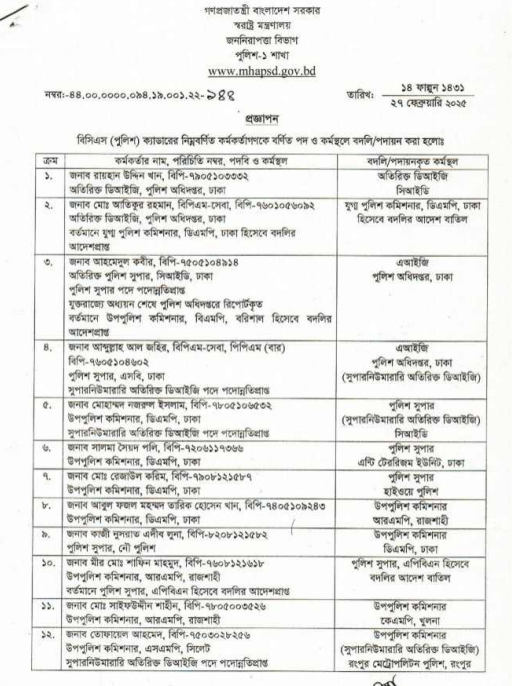 আরেক প্রজ্ঞাপন অনুযায়ী, পুলিশ সদর দপ্তরের অতিরিক্ত ডিআইজি রায়হান উদ্দিন খানকে সিআইডিতে, বিএমপিতে বদলির আদেশপ্রাপ্ত পুলিশ সুপার আহমেদুল কবীরকে পুলিশ সদর দপ্তরের এআইজি, আব্দুল্লাহ আল জহিরকে পুলিশ সদর দপ্তরের এআইজি, ডিএমপির উপ-পুলিশ কমিশনার মোহাম্মদ নজরুল ইসলামকে সিআইডিতেসহ ৩২ কর্মকর্তাকে বদলি করা হয়।